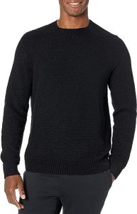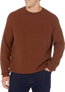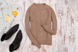 Brown sweater and black shoes on a wooden background. Fashionable concept