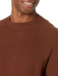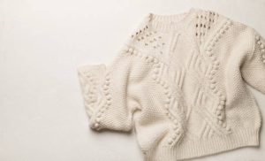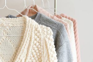 Bunch of knitted warm pastel color sweaters with different vertical knitting patterns hanging on the rack, clearly visible texture. Stylish fall / winter season knitwear clothing. Close up, copy space