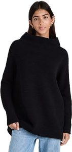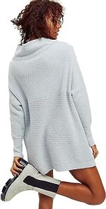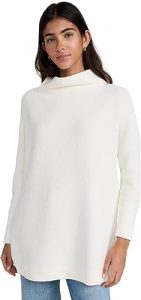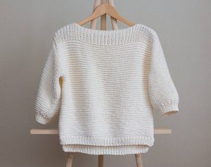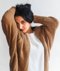 Studio shot of Danish female model wearing fashionable knit-work: zipper slip-over