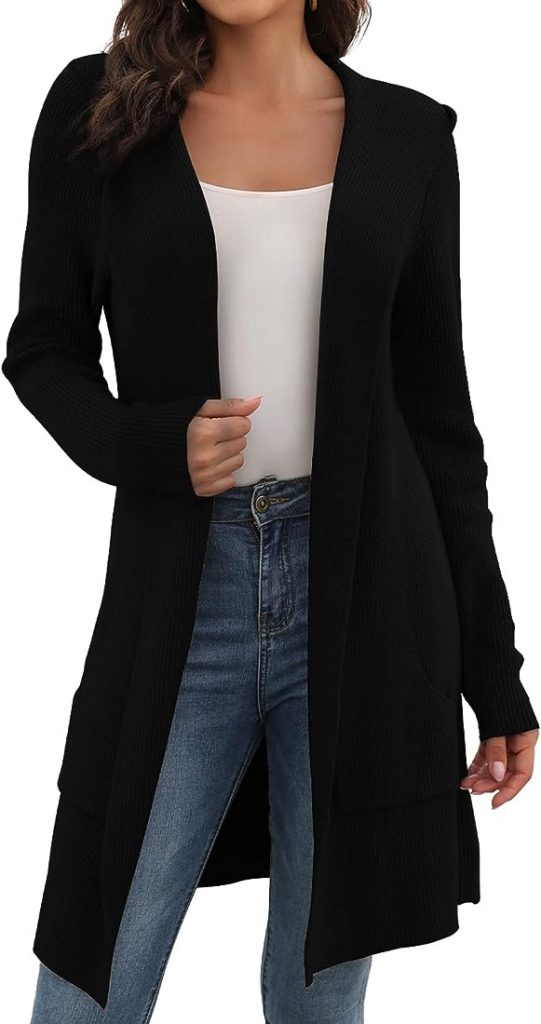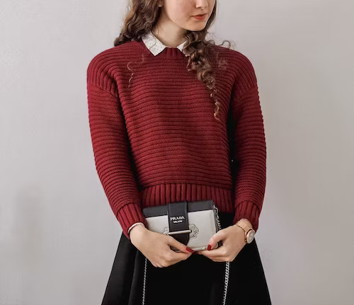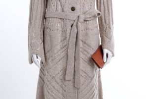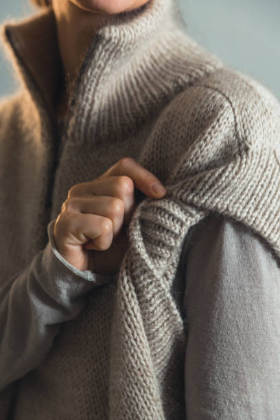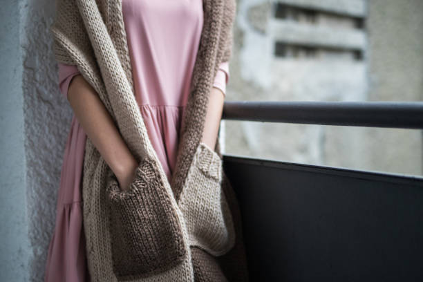 Female grey knitted cardigan close up. Female mannequin with fashionable clothing and brown wallet. Ladies modern clothes and accessories.