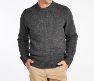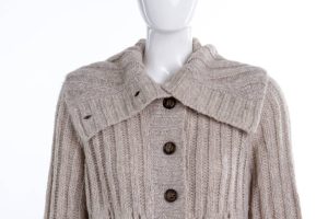 Close up grey buttoned pullover for women. Close up female mannequin dressed in knitted sweater with collar.