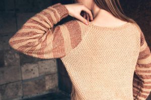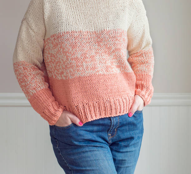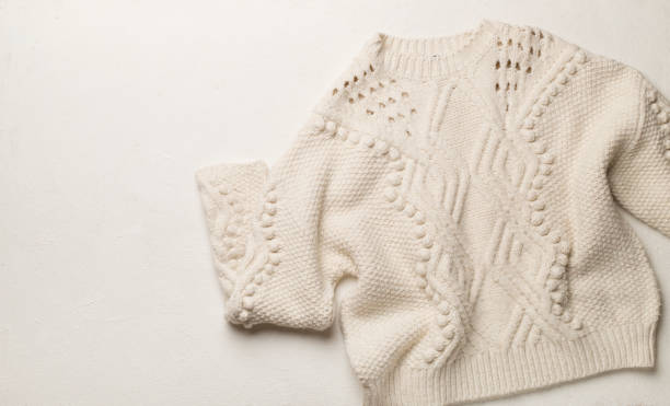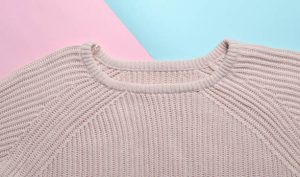 Female sweater flesh-colored on a pink blue pastel background. Top view.
