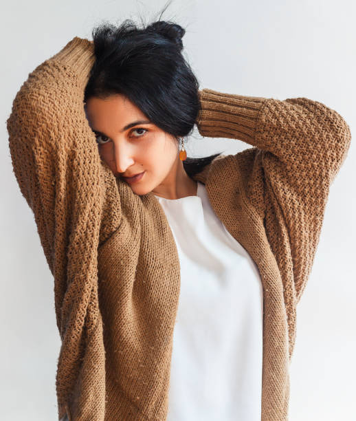 Portrait of charming middle-eastern woman. Pretty beautiful female in warming sweater posing against white background