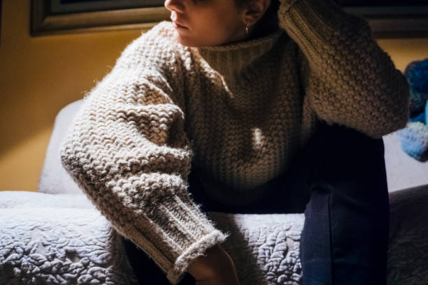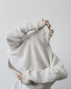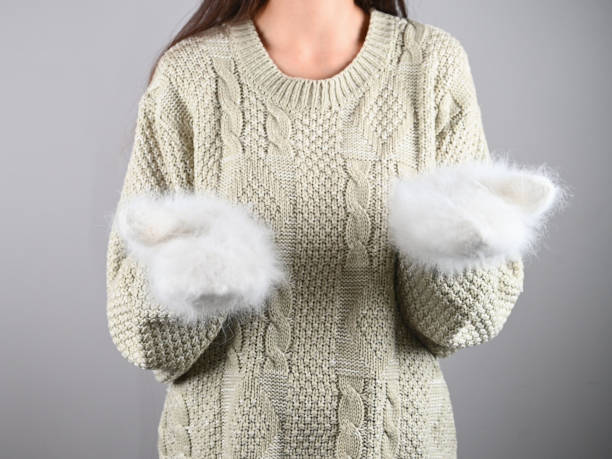 woman in a sweater holds a thermomug with a hot drink in her hands on gray wall background