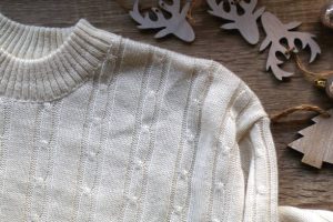 White cable knit sweater and various Christmas decorations on wooden background. Flat lay.