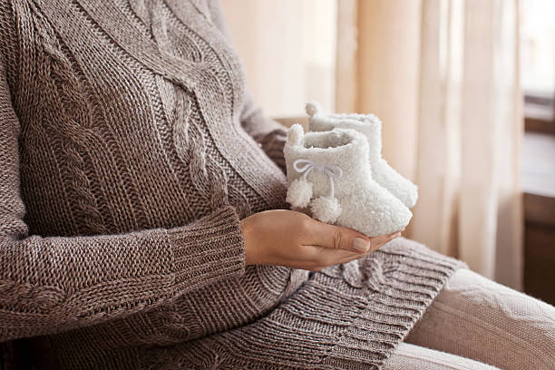 Close up on pregnant belly. Woman expecting a baby with a belly holding baby shoes